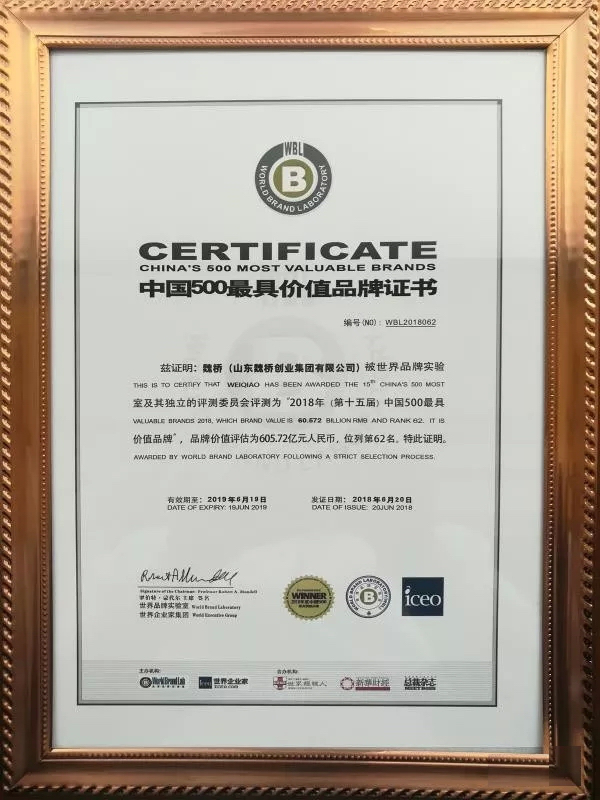 6月20日,由世界品牌實驗室主辦的第十五屆“世界品牌大會”發布了2018年《中國500最具價值品牌》分析報告,“魏橋”品牌價值605.72億元,比2017年增長87.57億元,增幅近17%。這也是自2004年世界品牌實驗室首次發布《中國500最具價值品牌》報告以來,魏橋連續第15年上榜。